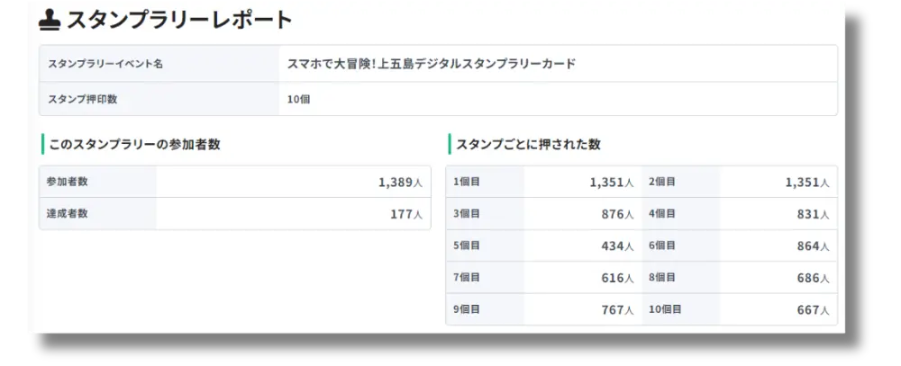 スタンプラリーを集めた数で絞り込んだり、達成者だけを絞り込んだりすることも可能です。